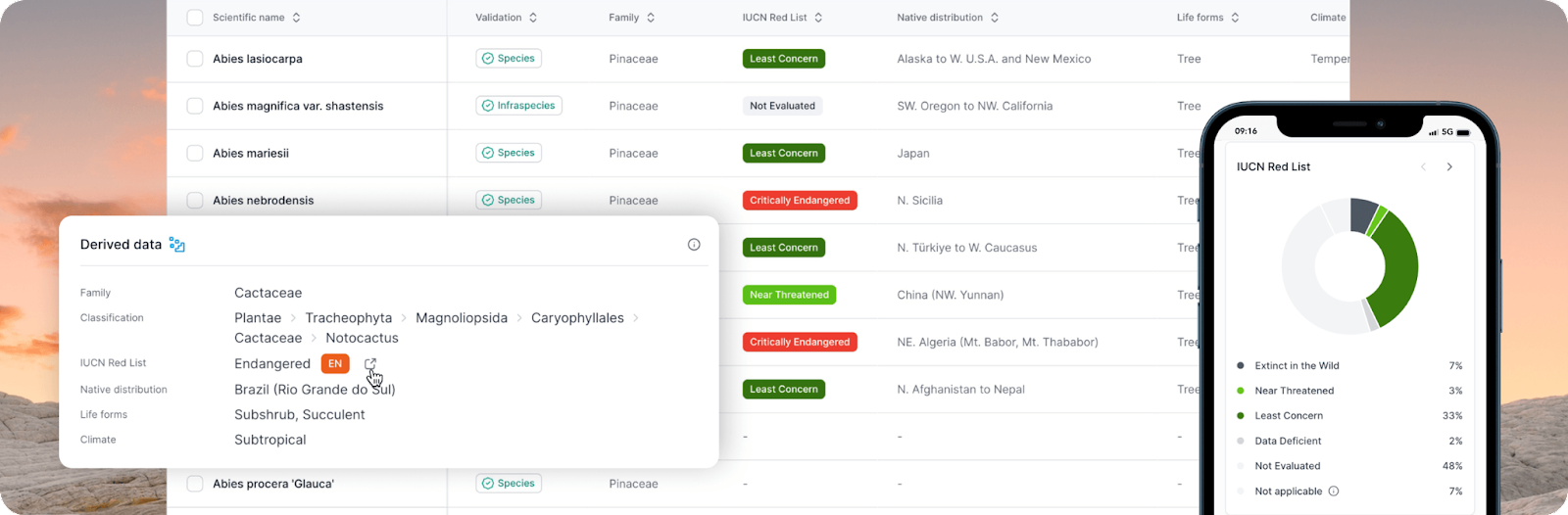 - View and filter IUCN Red List status, life forms, native distribution and climate in data tables for all record types