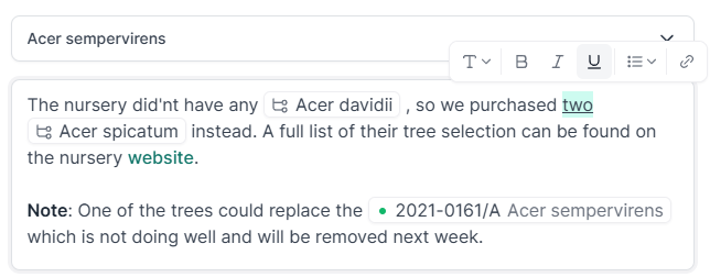 However, there is more! You can now reference taxa, accessions, and plant material records directly within your notes. Simply type @ and select the record you want to link to. This makes it easier than ever to keep your data connected and contextualized.